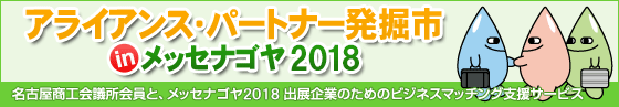 「アライアンス・パートナー発掘市 in メッセナゴヤ2018」は名古屋商工会議所が実施する、事前調整型のビジネスマッチング支援サービスです。国内外から多種多様な企業が集結する国際総合見本市「メッセナゴヤ2018」において、出展企業と地元名古屋商工会議所の会員企業との交流により、新たなビジネスチャンスを生み出します。